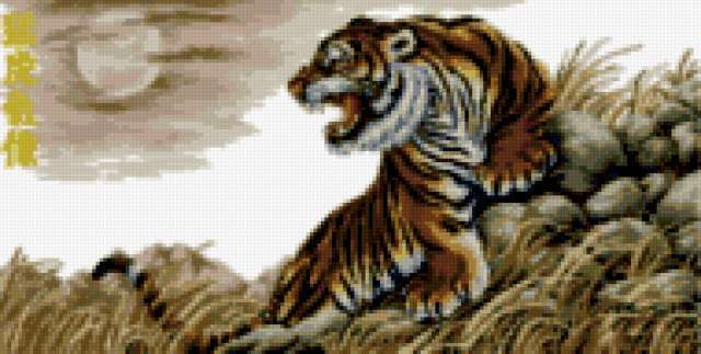 Ориентировочно так, схема вышивки «Тигр», созданная автором -tatka-, будет выглядеть при отшиве на канве. Размер данной вышивки равен 190x96 крестов, при этом используется 52 цветов. Ключевые слова, по которым можно найти эту схему: животные, тигр, кошки. Также, вы можете взглянуть на оригинальную картинку, соответствующую данной схеме вышивки.