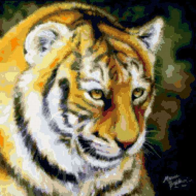 Ориентировочно так, схема вышивки «Тигр», созданная автором Elena8338, будет выглядеть при отшиве на канве. Размер данной вышивки равен 190x190 крестов, при этом используется 43 цветов. Ключевые слова, по которым можно найти эту схему: тигр, живопись, картина. Также, вы можете взглянуть на оригинальную картинку, соответствующую данной схеме вышивки.