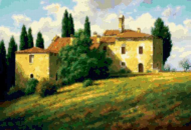 Ориентировочно так, схема вышивки «Тоскания», созданная автором lv-sunflower, будет выглядеть при отшиве на канве. Размер данной вышивки равен 190x130 крестов, при этом используется 70 цветов. Ключевые слова, по которым можно найти эту схему: тоскания, пейзаж, природа. Также, вы можете взглянуть на оригинальную картинку, соответствующую данной схеме вышивки.