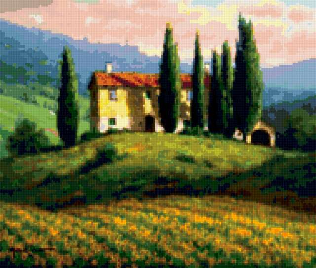 Ориентировочно так, схема вышивки «Тоскнский пейзаж», созданная автором lv-sunflower, будет выглядеть при отшиве на канве. Размер данной вышивки равен 190x161 крестов, при этом используется 69 цветов. Ключевые слова, по которым можно найти эту схему: тоскания, пейзаж, природа. Также, вы можете взглянуть на оригинальную картинку, соответствующую данной схеме вышивки.