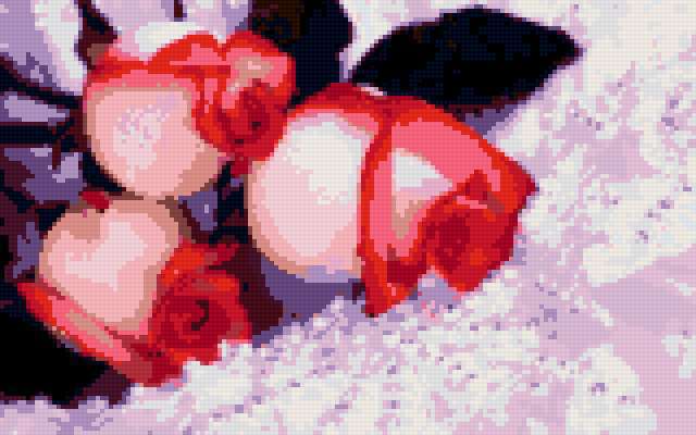 Ориентировочно так, схема вышивки «Три розы», созданная автором ollga-1986, будет выглядеть при отшиве на канве. Размер данной вышивки равен 160x100 крестов, при этом используется 24 цветов. К несчастью, автор не назначил для схемы ключевые слова. Также, вы можете взглянуть на оригинальную картинку, соответствующую данной схеме вышивки.