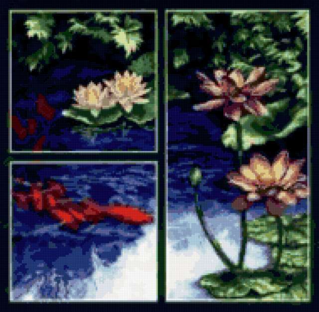 Ориентировочно так, схема вышивки «Триптих Лотосы и рыбы», созданная автором Marina22, будет выглядеть при отшиве на канве. Размер данной вышивки равен 190x186 крестов, при этом используется 69 цветов. Ключевые слова, по которым можно найти эту схему: цветы, рыба. Также, вы можете взглянуть на оригинальную картинку, соответствующую данной схеме вышивки.
