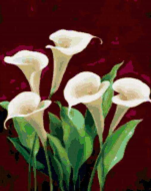 Ориентировочно так, схема вышивки «Триптих каллы ч2», созданная автором Luda49, будет выглядеть при отшиве на канве. Размер данной вышивки равен 151x190 крестов, при этом используется 46 цветов. К несчастью, автор не назначил для схемы ключевые слова. Также, вы можете взглянуть на оригинальную картинку, соответствующую данной схеме вышивки.