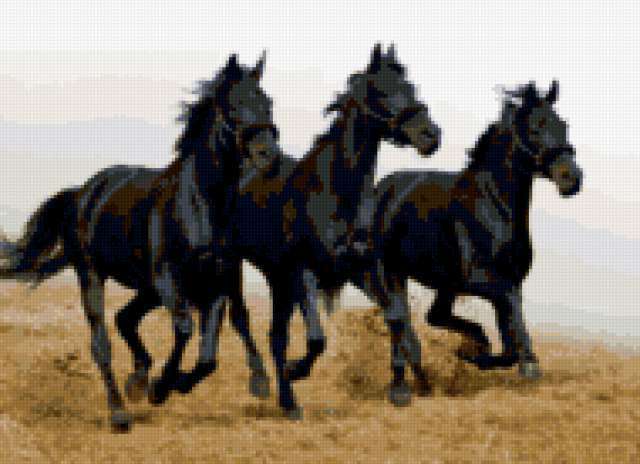 Ориентировочно так, схема вышивки «Тройка», созданная автором lv-sunflower, будет выглядеть при отшиве на канве. Размер данной вышивки равен 190x138 крестов, при этом используется 43 цветов. Ключевые слова, по которым можно найти эту схему: конь, лошадь, животные. Также, вы можете взглянуть на оригинальную картинку, соответствующую данной схеме вышивки.