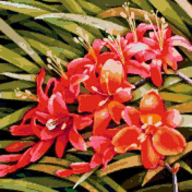 Ориентировочно так, схема вышивки «Тропические цветы», созданная автором poltanya, будет выглядеть при отшиве на канве. Размер данной вышивки равен 176x176 крестов, при этом используется 40 цветов. Ключевые слова, по которым можно найти эту схему: растения, цветы, тропические цветы, цветочки, флора, нежные лепестки, искусство. Также, вы можете взглянуть на оригинальную картинку, соответствующую данной схеме вышивки.