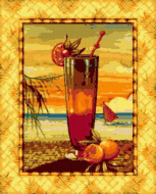 Ориентировочно так, схема вышивки «Тропический коктейль», созданная автором Eddy, будет выглядеть при отшиве на канве. Размер данной вышивки равен 153x190 крестов, при этом используется 28 цветов. Ключевые слова, по которым можно найти эту схему: кухня, натюрморт, коктейль. Также, вы можете взглянуть на оригинальную картинку, соответствующую данной схеме вышивки.