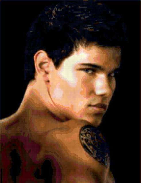 Ориентировочно так, схема вышивки «Тэйлор Лотнер», созданная автором 23121984, будет выглядеть при отшиве на канве. Размер данной вышивки равен 146x190 крестов, при этом используется 47 цветов. Ключевые слова, по которым можно найти эту схему: актеры, сумерки. Также, вы можете взглянуть на оригинальную картинку, соответствующую данной схеме вышивки.