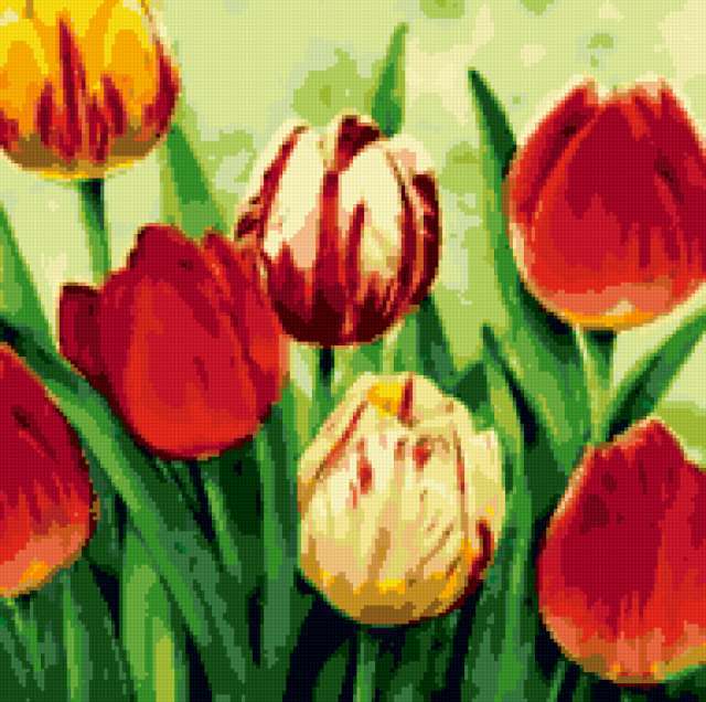 Ориентировочно так, схема вышивки «Тюльпаны», созданная автором poltanya, будет выглядеть при отшиве на канве. Размер данной вышивки равен 190x189 крестов, при этом используется 33 цветов. Ключевые слова, по которым можно найти эту схему: тюльпаны, тюльпан, цветы, панно, надпись, нежные лепестки, весенние цветы, флора. Также, вы можете взглянуть на оригинальную картинку, соответствующую данной схеме вышивки.