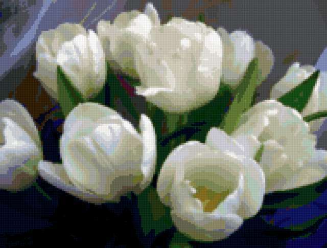 Ориентировочно так, схема вышивки «Тюльпаны», созданная автором Nikolaeva, будет выглядеть при отшиве на канве. Размер данной вышивки равен 190x144 крестов, при этом используется 62 цветов. Ключевые слова, по которым можно найти эту схему: вышивка. Также, вы можете взглянуть на оригинальную картинку, соответствующую данной схеме вышивки.