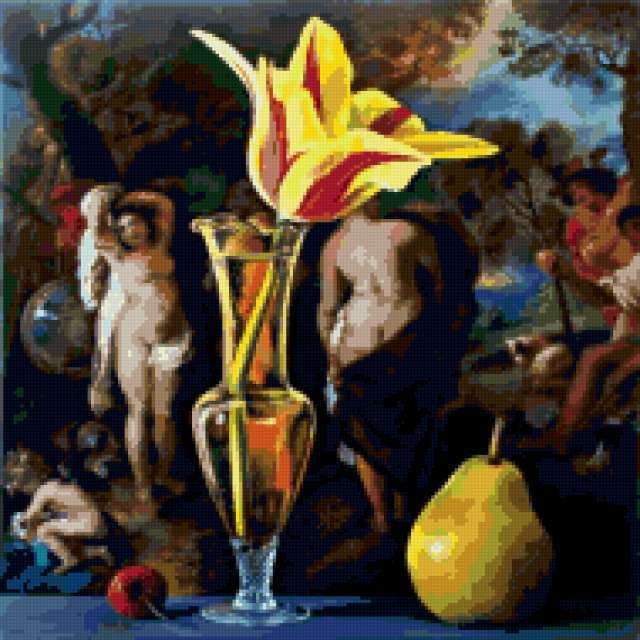 Ориентировочно так, схема вышивки «Тюльпан», созданная автором alena4, будет выглядеть при отшиве на канве. Размер данной вышивки равен 190x190 крестов, при этом используется 78 цветов. Ключевые слова, по которым можно найти эту схему: тюльпан, цветок, картина, люди, груша, ваза. Также, вы можете взглянуть на оригинальную картинку, соответствующую данной схеме вышивки.