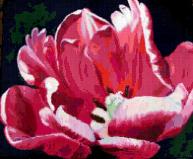 Ориентировочно так, схема вышивки «Тюльпан», созданная автором eldi_22, будет выглядеть при отшиве на канве. Размер данной вышивки равен 190x157 крестов, при этом используется 61 цветов. Ключевые слова, по которым можно найти эту схему: тюльпан, цветы, картина. Также, вы можете взглянуть на оригинальную картинку, соответствующую данной схеме вышивки.