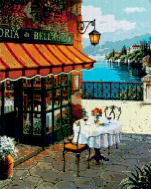 Ориентировочно так, схема вышивки «У моря», созданная автором poltanya, будет выглядеть при отшиве на канве. Размер данной вышивки равен 152x190 крестов, при этом используется 52 цветов. Ключевые слова, по которым можно найти эту схему: италия, пейзаж, море, красота, уютный уголок. Также, вы можете взглянуть на оригинальную картинку, соответствующую данной схеме вышивки.