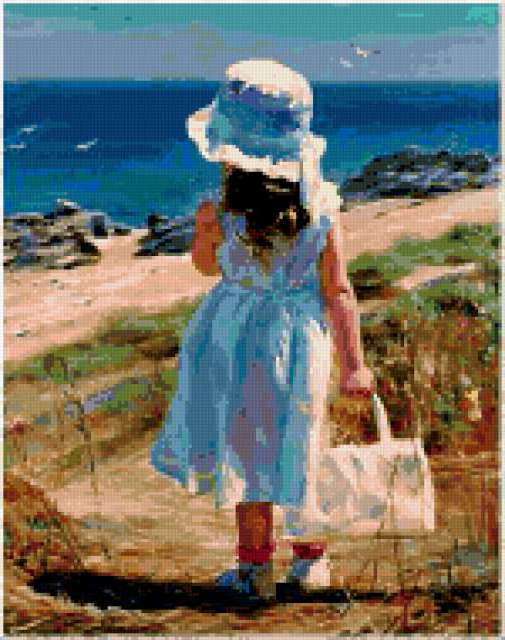 Ориентировочно так, схема вышивки «У моря», созданная автором fox-lenshik, будет выглядеть при отшиве на канве. Размер данной вышивки равен 150x190 крестов, при этом используется 80 цветов. К несчастью, автор не назначил для схемы ключевые слова. Также, вы можете взглянуть на оригинальную картинку, соответствующую данной схеме вышивки.