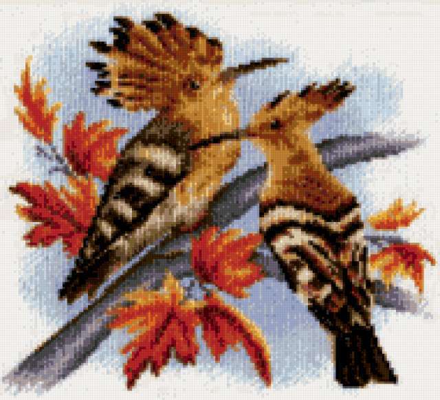 Ориентировочно так, схема вышивки «Удоды», созданная автором margoritag, будет выглядеть при отшиве на канве. Размер данной вышивки равен 190x173 крестов, при этом используется 45 цветов. Ключевые слова, по которым можно найти эту схему: птицы, картинка, разное, рисунок, пара, удоды. Также, вы можете взглянуть на оригинальную картинку, соответствующую данной схеме вышивки.