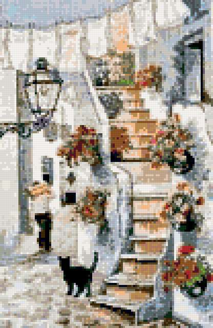 Ориентировочно так, схема вышивки «Улочка», созданная автором Kica, будет выглядеть при отшиве на канве. Размер данной вышивки равен 104x160 крестов, при этом используется 45 цветов. Ключевые слова, по которым можно найти эту схему: улицы, города, местность. Также, вы можете взглянуть на оригинальную картинку, соответствующую данной схеме вышивки.