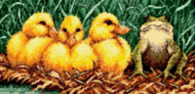 Ориентировочно так, схема вышивки «Утята», созданная автором GINTARE123, будет выглядеть при отшиве на канве. Размер данной вышивки равен 190x92 крестов, при этом используется 72 цветов. Ключевые слова, по которым можно найти эту схему: птицы. Также, вы можете взглянуть на оригинальную картинку, соответствующую данной схеме вышивки.