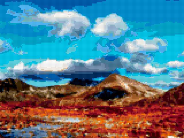 Ориентировочно так, схема вышивки «Утёс», созданная автором krisone, будет выглядеть при отшиве на канве. Размер данной вышивки равен 160x120 крестов, при этом используется 67 цветов. Ключевые слова, по которым можно найти эту схему: горы. Также, вы можете взглянуть на оригинальную картинку, соответствующую данной схеме вышивки.