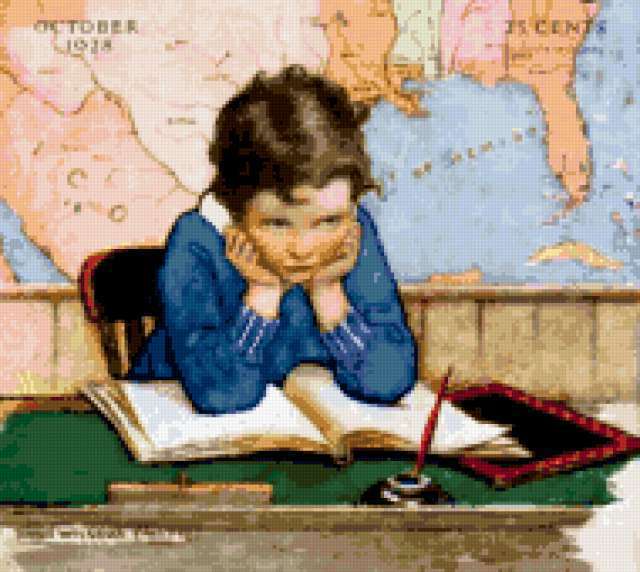 Ориентировочно так, схема вышивки «Ученик учил уроки...», созданная автором rybka6, будет выглядеть при отшиве на канве. Размер данной вышивки равен 190x170 крестов, при этом используется 65 цветов. Ключевые слова, по которым можно найти эту схему: ретро, искусство, ребёнок, мальчик, ученик, школа, книга, карта, портрет, искусство, картина. Также, вы можете взглянуть на оригинальную картинку, соответствующую данной схеме вышивки.