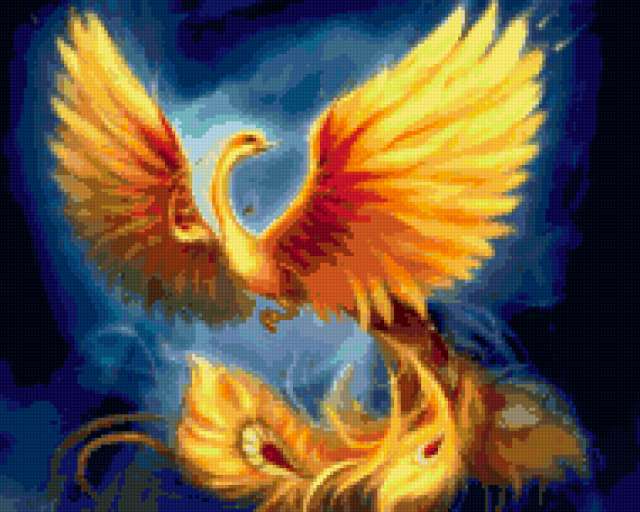 Ориентировочно так, схема вышивки «Феникс», созданная автором pomka2006, будет выглядеть при отшиве на канве. Размер данной вышивки равен 190x152 крестов, при этом используется 76 цветов. Ключевые слова, по которым можно найти эту схему: феникс, птицы. Также, вы можете взглянуть на оригинальную картинку, соответствующую данной схеме вышивки.