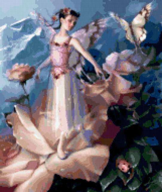 Ориентировочно так, схема вышивки «Фея», созданная автором 1978swetik, будет выглядеть при отшиве на канве. Размер данной вышивки равен 161x190 крестов, при этом используется 73 цветов. Ключевые слова, по которым можно найти эту схему: фея, дюймовочка, цветы, бабочка, сказка, крылья. Также, вы можете взглянуть на оригинальную картинку, соответствующую данной схеме вышивки.