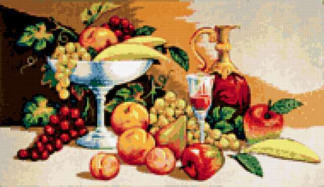 Ориентировочно так, схема вышивки «Фрукты», созданная автором s-elena, будет выглядеть при отшиве на канве. Размер данной вышивки равен 190x110 крестов, при этом используется 64 цветов. Ключевые слова, по которым можно найти эту схему: натюрморт, фрукты, виноград. Также, вы можете взглянуть на оригинальную картинку, соответствующую данной схеме вышивки.