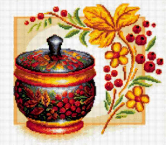 Ориентировочно так, схема вышивки «Хахлома», созданная автором smorodina2410, будет выглядеть при отшиве на канве. Размер данной вышивки равен 190x166 крестов, при этом используется 66 цветов. Ключевые слова, по которым можно найти эту схему: посуда, кухня, цветы. Также, вы можете взглянуть на оригинальную картинку, соответствующую данной схеме вышивки.