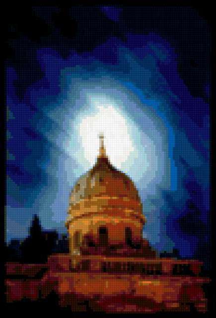 Ориентировочно так, схема вышивки «Храм», созданная автором lucha, будет выглядеть при отшиве на канве. Размер данной вышивки равен 100x147 крестов, при этом используется 54 цветов. Ключевые слова, по которым можно найти эту схему: храм. Также, вы можете взглянуть на оригинальную картинку, соответствующую данной схеме вышивки.