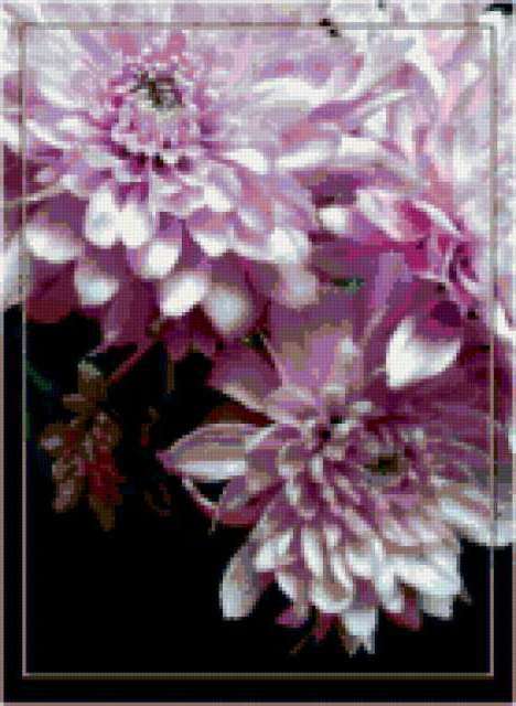 Ориентировочно так, схема вышивки «Хризантемы», созданная автором milacha974, будет выглядеть при отшиве на канве. Размер данной вышивки равен 139x190 крестов, при этом используется 54 цветов. Ключевые слова, по которым можно найти эту схему: хризантемы, цветы. Также, вы можете взглянуть на оригинальную картинку, соответствующую данной схеме вышивки.