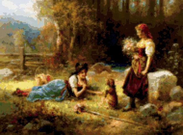 Ориентировочно так, схема вышивки «Художник Ханс Зацка», созданная автором burova, будет выглядеть при отшиве на канве. Размер данной вышивки равен 190x140 крестов, при этом используется 76 цветов. Ключевые слова, по которым можно найти эту схему: картина, пейзаж, природа, девушки. Также, вы можете взглянуть на оригинальную картинку, соответствующую данной схеме вышивки.
