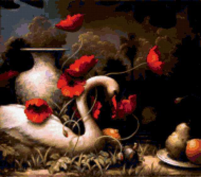 Ориентировочно так, схема вышивки «Хх1169», созданная автором polovinkamarinka, будет выглядеть при отшиве на канве. Размер данной вышивки равен 190x167 крестов, при этом используется 63 цветов. Ключевые слова, по которым можно найти эту схему: картина. Также, вы можете взглянуть на оригинальную картинку, соответствующую данной схеме вышивки.