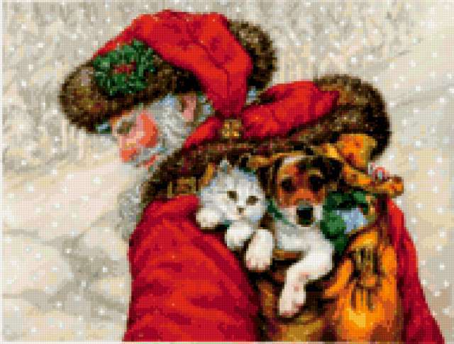 Ориентировочно так, схема вышивки «Хх2982», созданная автором polovinkamarinka, будет выглядеть при отшиве на канве. Размер данной вышивки равен 190x144 крестов, при этом используется 74 цветов. Ключевые слова, по которым можно найти эту схему: картина, животные, зима, дед мороз, сказка. Также, вы можете взглянуть на оригинальную картинку, соответствующую данной схеме вышивки.