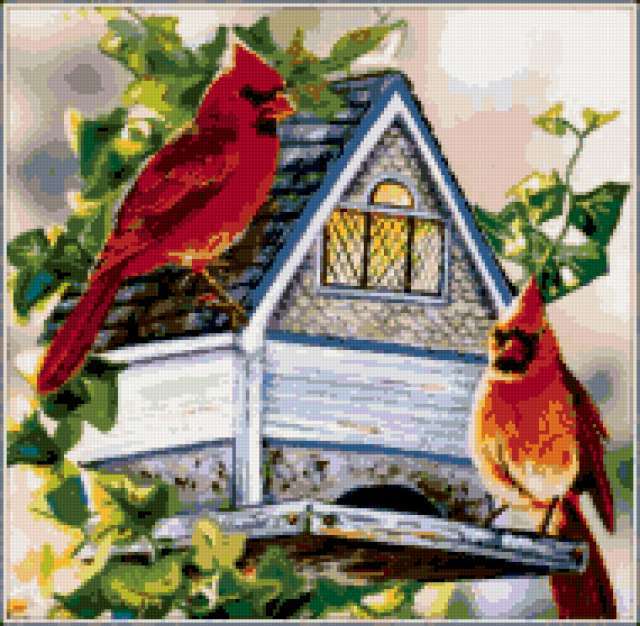 Ориентировочно так, схема вышивки «Хх3774», созданная автором polovinkamarinka, будет выглядеть при отшиве на канве. Размер данной вышивки равен 190x186 крестов, при этом используется 57 цветов. Ключевые слова, по которым можно найти эту схему: картина, птицы, домик. Также, вы можете взглянуть на оригинальную картинку, соответствующую данной схеме вышивки.