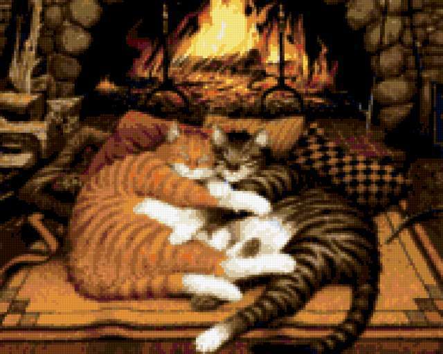 Ориентировочно так, схема вышивки «Хх5110», созданная автором polovinkamarinka, будет выглядеть при отшиве на канве. Размер данной вышивки равен 190x152 крестов, при этом используется 36 цветов. Ключевые слова, по которым можно найти эту схему: картина, кошки, огонь. Также, вы можете взглянуть на оригинальную картинку, соответствующую данной схеме вышивки.