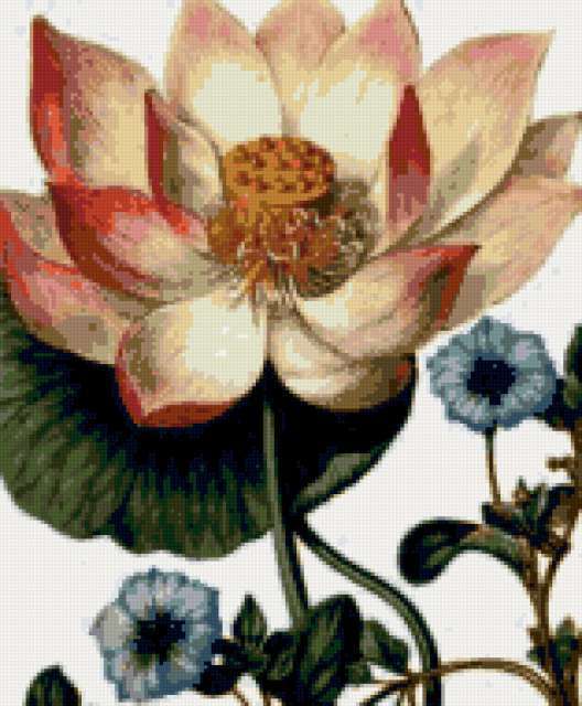 Ориентировочно так, схема вышивки «Цветок лотоса», созданная автором rybka6, будет выглядеть при отшиве на канве. Размер данной вышивки равен 157x190 крестов, при этом используется 45 цветов. Ключевые слова, по которым можно найти эту схему: растения, цветы, розовые, лепестки, лотос, лилия, кувшинка. Также, вы можете взглянуть на оригинальную картинку, соответствующую данной схеме вышивки.
