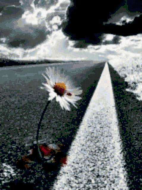 Ориентировочно так, схема вышивки «Цветок», созданная автором riko, будет выглядеть при отшиве на канве. Размер данной вышивки равен 142x190 крестов, при этом используется 54 цветов. Ключевые слова, по которым можно найти эту схему: цветы, асфальт, кровь. Также, вы можете взглянуть на оригинальную картинку, соответствующую данной схеме вышивки.