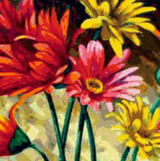 Ориентировочно так, схема вышивки «Цветочки», созданная автором rybka6, будет выглядеть при отшиве на канве. Размер данной вышивки равен 189x190 крестов, при этом используется 55 цветов. Ключевые слова, по которым можно найти эту схему: цветы, весна, лепестки, розовые, флора. Также, вы можете взглянуть на оригинальную картинку, соответствующую данной схеме вышивки.