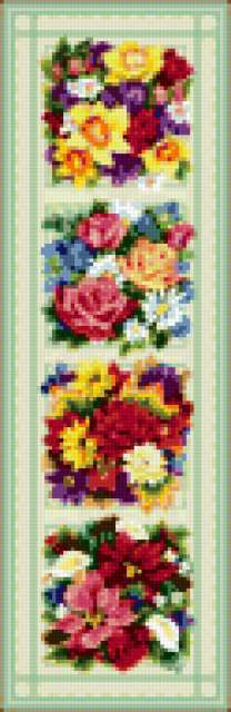 Ориентировочно так, схема вышивки «Цветочное панно», созданная автором poltanya, будет выглядеть при отшиве на канве. Размер данной вышивки равен 62x190 крестов, при этом используется 49 цветов. Ключевые слова, по которым можно найти эту схему: цветы, мини-вышивки, ромашки, пионы, розы, васильки. Также, вы можете взглянуть на оригинальную картинку, соответствующую данной схеме вышивки.