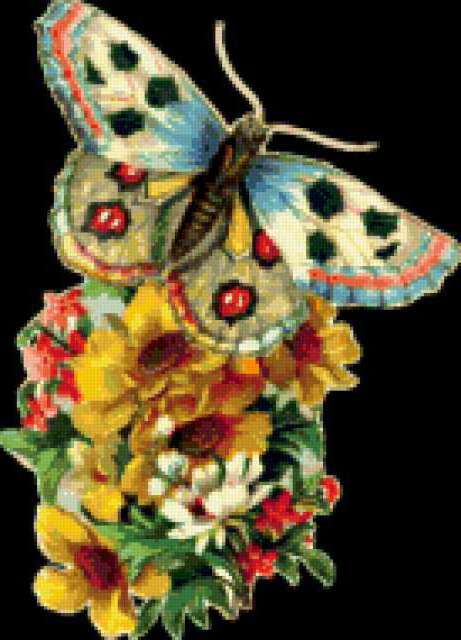 Ориентировочно так, схема вышивки «Цветы и бабочки», созданная автором BiataV, будет выглядеть при отшиве на канве. Размер данной вышивки равен 137x190 крестов, при этом используется 83 цветов. Ключевые слова, по которым можно найти эту схему: цветы, бабочка, рисованные цветы, винтажные цветы, винтаж. Также, вы можете взглянуть на оригинальную картинку, соответствующую данной схеме вышивки.