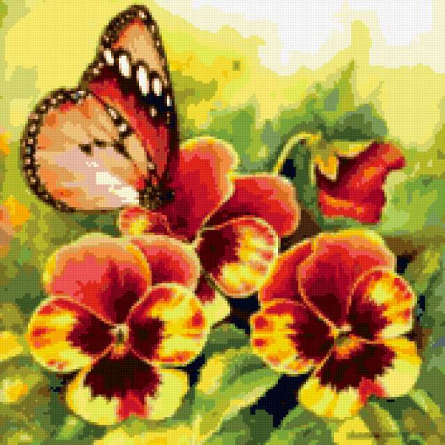 Ориентировочно так, схема вышивки «Цветы и бабочки», созданная автором poltanya, будет выглядеть при отшиве на канве. Размер данной вышивки равен 176x176 крестов, при этом используется 40 цветов. Ключевые слова, по которым можно найти эту схему: цветы и бабочки, анютки, анютины глазки, лилии, бабочка, бабочки, природа, красота, нежные лепестки, лето, флора. Также, вы можете взглянуть на оригинальную картинку, соответствующую данной схеме вышивки.