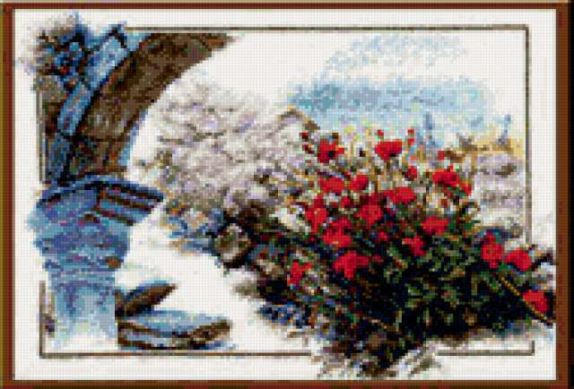 Ориентировочно так, схема вышивки «Цветы на развалинах», созданная автором smorodina2410, будет выглядеть при отшиве на канве. Размер данной вышивки равен 190x129 крестов, при этом используется 68 цветов. Ключевые слова, по которым можно найти эту схему: цветы, природа, лето, руины. Также, вы можете взглянуть на оригинальную картинку, соответствующую данной схеме вышивки.
