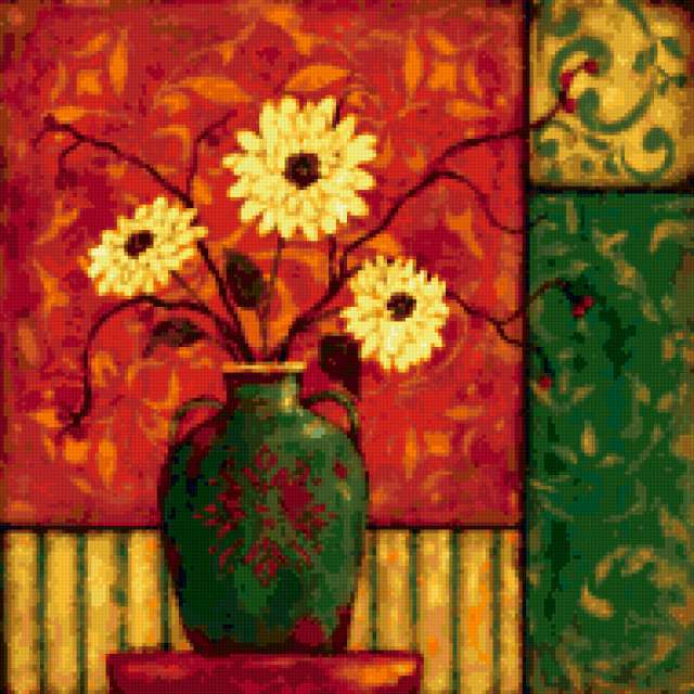 Ориентировочно так, схема вышивки «Цветы 1», созданная автором eldi_22, будет выглядеть при отшиве на канве. Размер данной вышивки равен 190x190 крестов, при этом используется 52 цветов. Ключевые слова, по которым можно найти эту схему: flowers, painting, цветы, вазы, картина. Также, вы можете взглянуть на оригинальную картинку, соответствующую данной схеме вышивки.