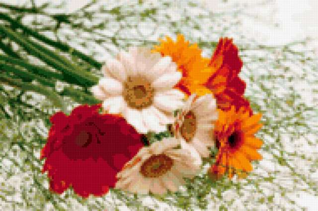 Ориентировочно так, схема вышивки «Цветы 5», созданная автором AIKArus, будет выглядеть при отшиве на канве. Размер данной вышивки равен 190x126 крестов, при этом используется 71 цветов. Ключевые слова, по которым можно найти эту схему: цветы, флора, герберы. Также, вы можете взглянуть на оригинальную картинку, соответствующую данной схеме вышивки.
