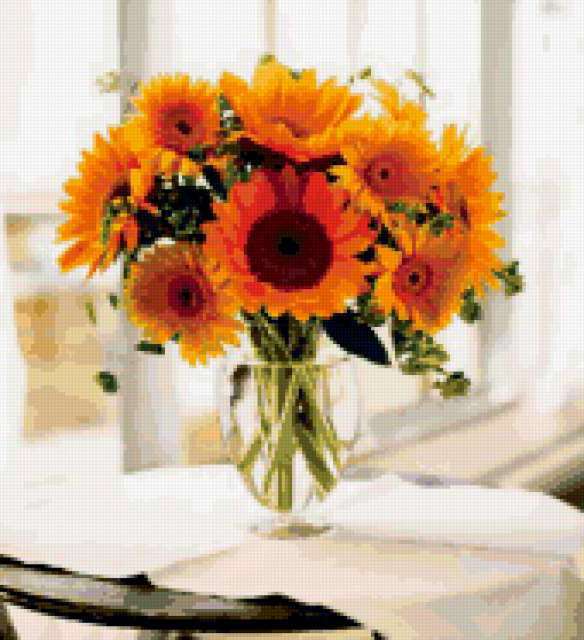 Ориентировочно так, схема вышивки «Цветы», созданная автором tykosz, будет выглядеть при отшиве на канве. Размер данной вышивки равен 170x186 крестов, при этом используется 76 цветов. Ключевые слова, по которым можно найти эту схему: цветы, букет, подсолнухи. Также, вы можете взглянуть на оригинальную картинку, соответствующую данной схеме вышивки.