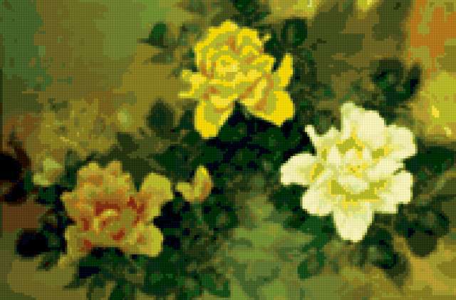 Ориентировочно так, схема вышивки «Цветы», созданная автором dobroslava, будет выглядеть при отшиве на канве. Размер данной вышивки равен 190x125 крестов, при этом используется 45 цветов. Ключевые слова, по которым можно найти эту схему: цветы, желтое. Также, вы можете взглянуть на оригинальную картинку, соответствующую данной схеме вышивки.
