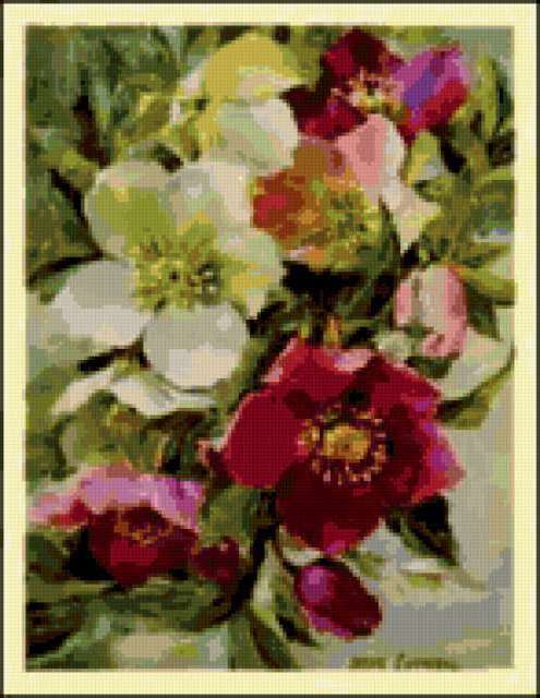 Ориентировочно так, схема вышивки «Цветы», созданная автором eldi_22, будет выглядеть при отшиве на канве. Размер данной вышивки равен 147x190 крестов, при этом используется 62 цветов. Ключевые слова, по которым можно найти эту схему: цветы, картина, живопись. Также, вы можете взглянуть на оригинальную картинку, соответствующую данной схеме вышивки.