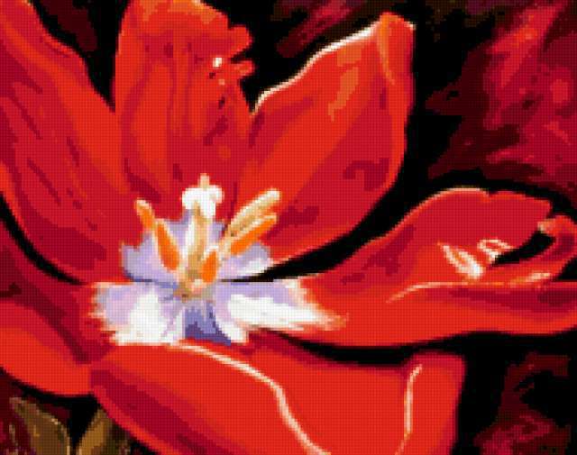 Ориентировочно так, схема вышивки «Цветы. Тюльпан», созданная автором BiataV, будет выглядеть при отшиве на канве. Размер данной вышивки равен 190x150 крестов, при этом используется 51 цветов. Ключевые слова, по которым можно найти эту схему: природа, цветы, тюльпан, картина, живопись, марсия болдуин. Также, вы можете взглянуть на оригинальную картинку, соответствующую данной схеме вышивки.