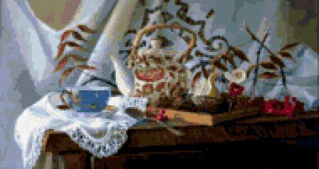 Ориентировочно так, схема вышивки «Чаепитие», созданная автором khersonkaira, будет выглядеть при отшиве на канве. Размер данной вышивки равен 190x101 крестов, при этом используется 58 цветов. К несчастью, автор не назначил для схемы ключевые слова. Также, вы можете взглянуть на оригинальную картинку, соответствующую данной схеме вышивки.