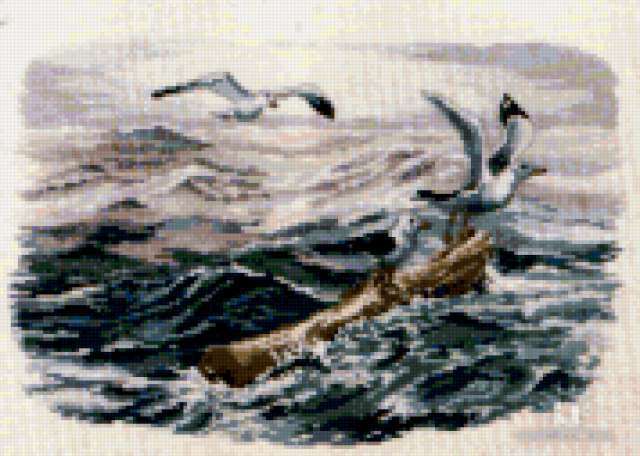 Ориентировочно так, схема вышивки «Чайки», созданная автором Olga1958, будет выглядеть при отшиве на канве. Размер данной вышивки равен 178x127 крестов, при этом используется 64 цветов. Ключевые слова, по которым можно найти эту схему: чайки. Также, вы можете взглянуть на оригинальную картинку, соответствующую данной схеме вышивки.