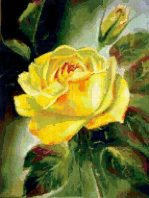 Ориентировочно так, схема вышивки «Чайная роза», созданная автором uzistka, будет выглядеть при отшиве на канве. Размер данной вышивки равен 143x190 крестов, при этом используется 71 цветов. Ключевые слова, по которым можно найти эту схему: цветок, роза, желтая, чайная. Также, вы можете взглянуть на оригинальную картинку, соответствующую данной схеме вышивки.
