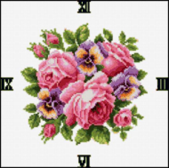 Ориентировочно так, схема вышивки «Чайные розы», созданная автором Minin, будет выглядеть при отшиве на канве. Размер данной вышивки равен 190x189 крестов, при этом используется 58 цветов. Ключевые слова, по которым можно найти эту схему: живопись, искусство, картина, природа, цветы, часы. Также, вы можете взглянуть на оригинальную картинку, соответствующую данной схеме вышивки.